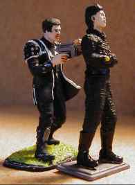 Well, they're gorgeous. Not that I know much about miniatures - I'm not a collector - but my small Blake and Avon (sitting on the computer surrounded by a Marvin the Martian, five plastic cornflake-box aliens and an unpainted Warhammer monster) look absolutely wonderful to me. As small as they are, they really do look like *them* - Avon's features and stance are particularly good (was someone watching the end of 'Blake' for that expression?); Blake's curls are lovely (I didn't think you could get them to look real that tiny) and my model even seems to have that stubborn set of the jaw (well, I like to think so). The costumes are well done as well, Avon's black and white from 4th series, and Blake's green outdoor suit (I always liked that one, and I guess the melon sleeves would have been impossible to model, let alone paint).