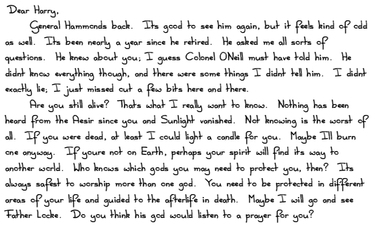 No access to off-world technology, never again. No access even to Earth technology; Heimdahl had taken Maybourne's wristwatch, all his books apart from the fiction, and Sunlight's plastic toys. Even Teddy Blue had had to be fought over, but at least that particular battle had been won, Heimdahl being finally convinced that the Goa'uld would not consider a cuddly toy to be a violation of the section of the treaty relating to the artificial advancement of technology on protected worlds. He still had his uniform too, complete with qualification pin and rank insignia. Presumably local metal-working techniques were at a reasonable level. Either that, or Heimdahl had concluded that the insignia provided no clues as to the techniques used to cast them. Maybourne was glad of that. No one here would recognise the uniform or understand what it meant, but it still felt good to wear it. It was a reminder of a time when he had been in control of his own life, when he'd been the one giving the orders.